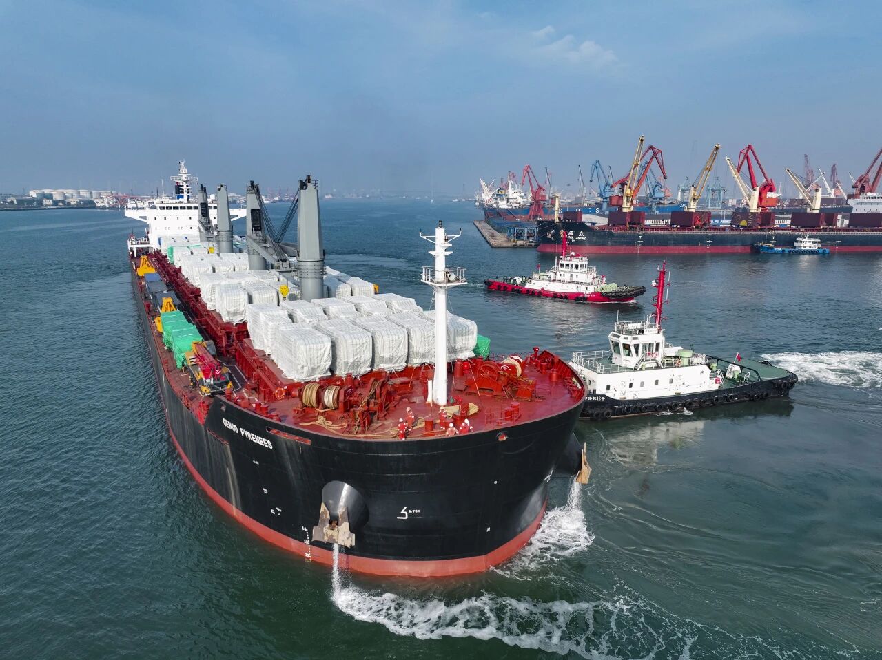 作為承擔此次裝卸任務的碼頭公司,天津港第四港埠有限公司一方面提前組織各相關單位召開船前會,針對該貨物特性與運輸需求、碼頭作業區域劃分、通關查驗流程等關鍵環節制定專屬方案。重點掌握“比利牛斯”輪的船舶類型、貨艙構造、艙內及甲板固定點位布局等關鍵信息,梳理裝卸工藝。科學統籌現有泊位,優化船舶進港流程,特別是在集團公司、邊檢、海關等部門的大力支持下,最終該輪提前3天進港靠泊,為后續裝卸作業搶出寶貴時間。天津港第四港埠有限公司操作部副經理李金勇介紹:“我們安排專人與貨代企業建立‘24小時對接機制’,實時跟進自卸車到碼頭的運輸進度,為貨物到港開辟‘綠色通道’,實現‘貨等船’的最優作業狀態。”